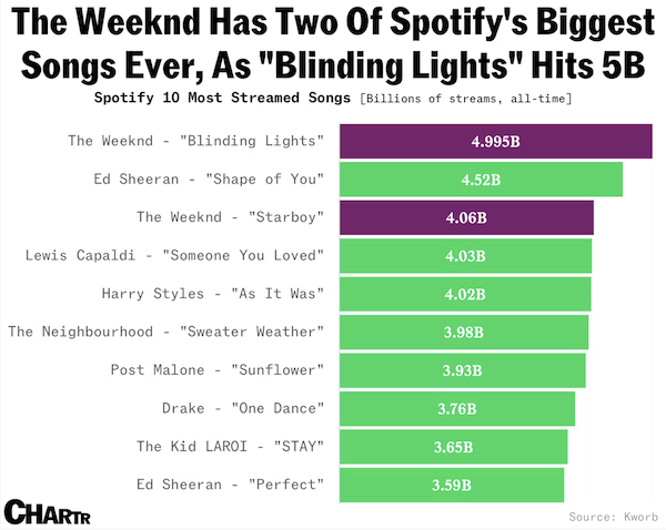 Spotify's most-played track is about to set a new benchmark. Blinding Lights by The Weeknd is days away from hitting 5 billion streams, the first song ever to cross that line.
