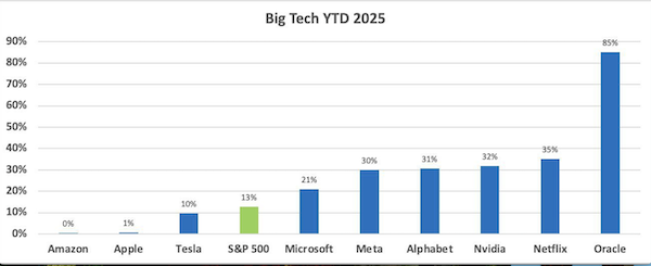 Big Tech's scoreboard for 2025 has a clear winner - Oracle, up 85% year-to-date. The old-school database giant has reinvented itself as an AI infrastructure player, scooping up monster cloud deals.