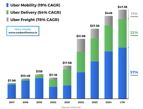 This graph from Carbon Finance breaks down Uber's revenues, and shows the growth over time. As you can see, it is far from being just a ride-hailing app. Delivery and freight now make up 43% of sales and are both growing fast. In fact, the non-ride-hailing side of the business grew 25% in the last 3 months.