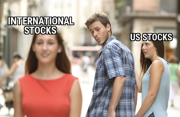 So far this year, international stocks are up 27.5% and US stocks are up 15.5%. But US stocks were up 24% in 2024 and international stocks were only up 4.7%. A 15.5% gain after such a strong year is a huge win. So don't get developing-market FOMO, just keep your eyes on the prize.