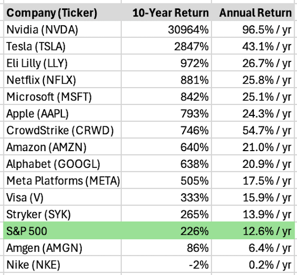The results are shown in the table below, and incorporate stock splits. Also, note that CrowdStrike has only been listed since 2019.