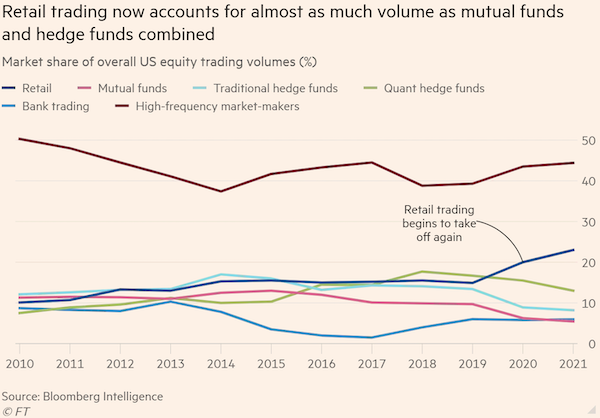 The FT article below points out that retail traders tend to get caught up in trending stocks/sectors, creating significant volatility. Think about travel sector share prices during Covid or the headline-grabbing GameStop, David vs Goliath, saga. I find it all very interesting to watch.
