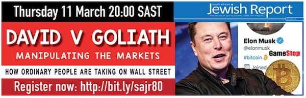 I'm doing something unusual tonight: taking part as a panellist on a webinar organised by the SA Jewish Report. The topic is "David vs Goliath: Manipulating the Markets - How Ordinary People are Taking on Wall Street". The promo says that Tesla, GameStop and Bitcoin will be discussed. Haha, that sounds hilarious!
